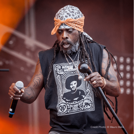 Artist the Ghetto Priest wearing a Zulu teeshirt during one of his performances
